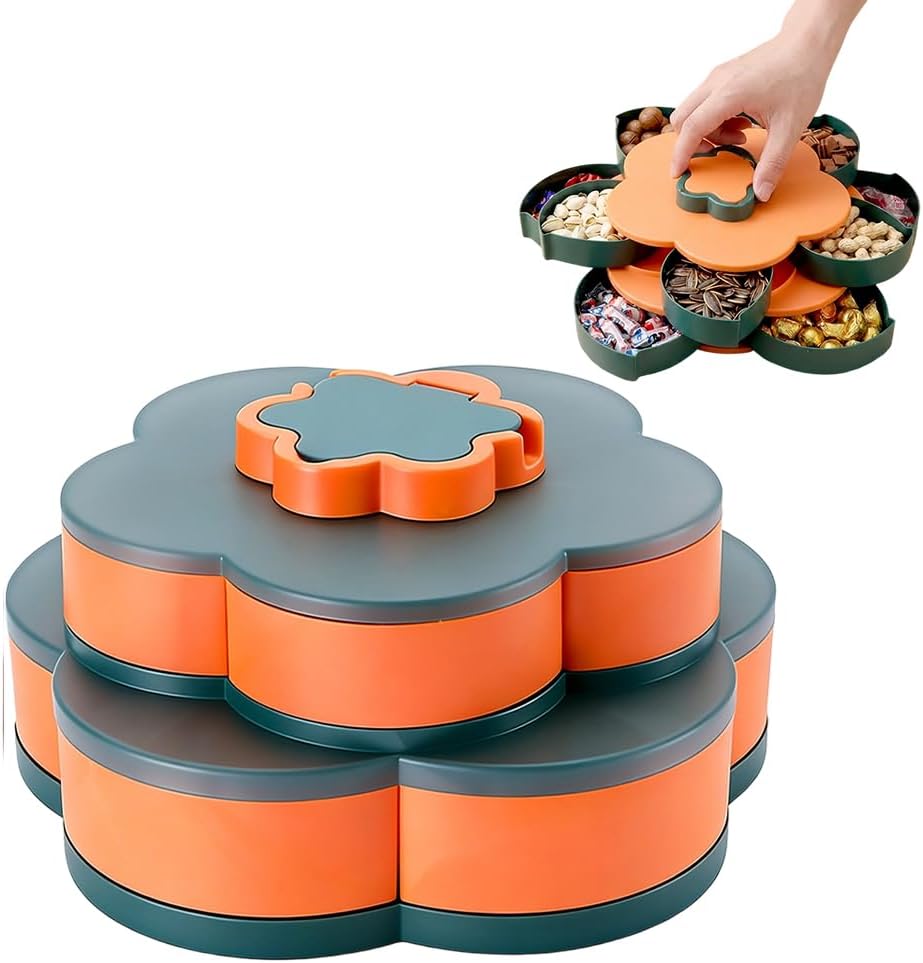 Rotating Snack Tray with Lid, Divided Snackle Box Container, Portable Organizer for Party Picnic Travel Usage Instructions 1. Open the snackle box container lid, and place snacks, fruits, veggies or dips into the spin snack tray’s divided grids separately. 2. Close the lid tightly to lock freshness; rotate the snack tray organizer smoothly for easy access to all foods. 3. For on-the-go use, carry gently; after use, clean detachable divided parts (if applicable). 4. Store the cleaned snack tray with lid in a dry, cool place to extend its service life. Notes Do not use the snackle box container or spin snack tray in microwave, oven or dishwasher to avoid damage. Do not place hot food (above 80℃) directly in the tray to prevent deformation or lid damage. Clean the divided spin and snack tray with a soft cloth/sponge; do not scratch the surface with sharp tools. Keep the snack tray organizer away from direct sunlight and high temperatures to maintain performance. Do not overload the tray to avoid jamming or damaging the rotating structure.